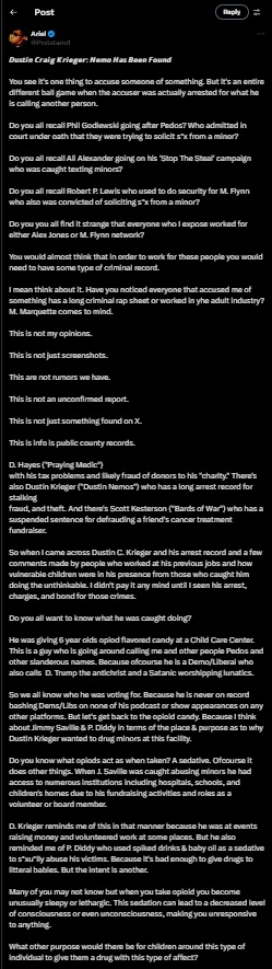 So we all know who he was voting for. Because he is never on record bashing Dems/Libs on none of his podcast or show appearances on any other platforms. But let’s get back to the opioid candy. Because I think about Jimmy Saville & P. Diddy in terms of the place & purpose as to why Dustin Krieger wanted to drug minors at this facility.