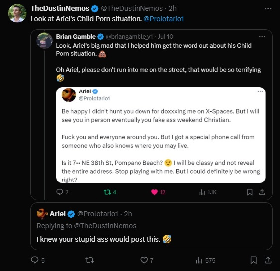 This triggered Ariel to try to get even with me and in a triggered rage, – After threatening to “load on” me if I continued exposing his CP, he doxxed me and promoted fake news in order to protect himself from his own confessions and lies around child porn. His audience is half a million subscribers, mine is a less than 10k. This lie has traveled far by virtue of the imbalance of his uncensored reach over my highl censored voice.