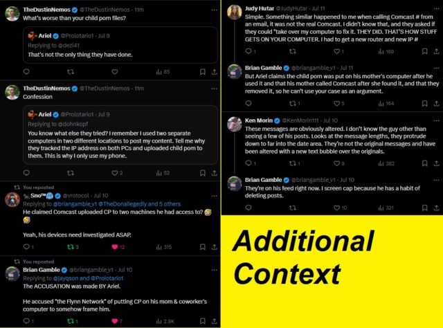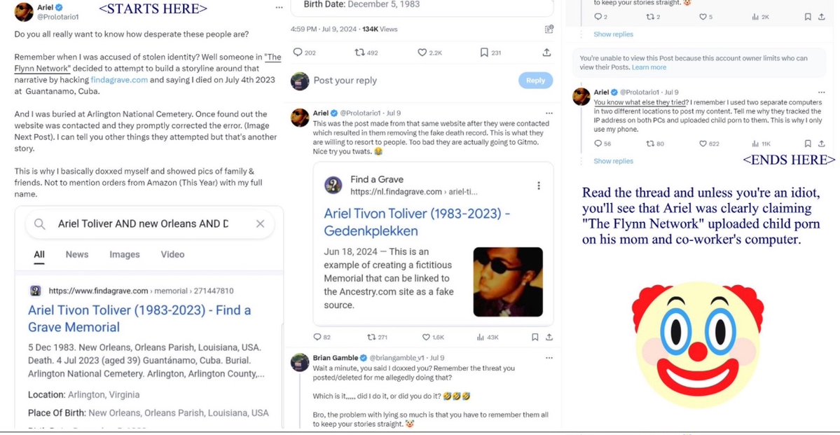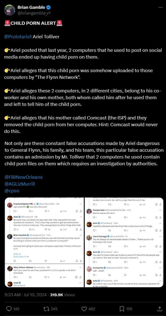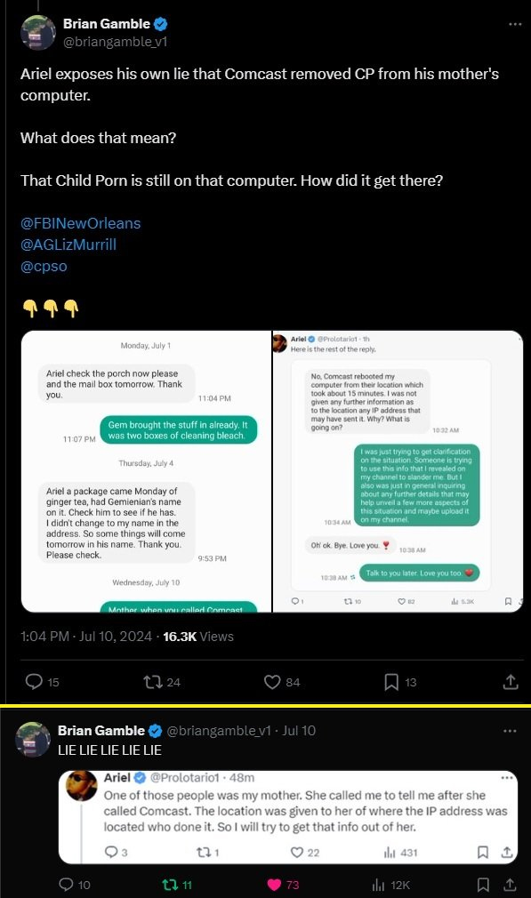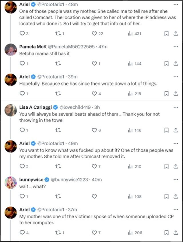 4. I have recently exposed Ariel’s Child porn collection initially exposed by Brian Gamble and others, in which Ariel confessed to child porn on multiple computers and then lied about it, blaming it on the Flynns and saying Comcast helped delete the porn stash and told them it was the Flynns. ) his own mother debunked this lie.