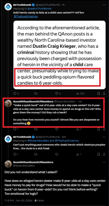 A Thread Since he is now baselessly accusing me of being a pedophile drug dealer who lures children away from playgrounds with opiate candies(such information, by the way, he sat on until I exposed him for collecting child porn) THEN this narrative magically showed up after I began to ask where the police were and why he wasn’t arrested yet? Seems convenient? Here’s a good rule of thumb. Ask for evidence – Extraordinary claims require extraordinary evidences. And I bring the receipts. He brings the baseless smears in fearful retaliation. So lets dive in, shall we?