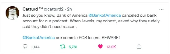 This evening Bank of America canceled popular conservative Twitter user Catturd’s podcast account. No reason was given.