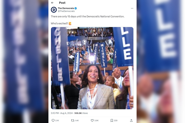 The official Democratic Party page on X uploaded a photo of Kamala Harris asking people if they were excited about the upcoming Democratic National Convention, but it was the signs in the background of the post that got people’s attention.