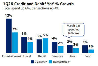 The BofA presentation Alastair cited showed that, for the first quarter, consumer spending at the pump was up 3%. For March, gas spending soared 16%. However, no meaningful spending pullbacks were visible elsewhere: Entertainment, travel, and retail spending all remained healthy, with entertainment spending rising 12% in the quarter.