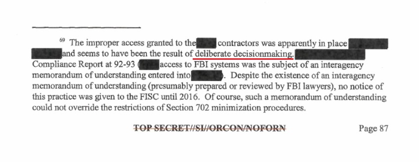 This specific footnote is a key. Note the phrase: “([redacted] access to FBI systems was the subject of an interagency memorandum of understanding entered into [redacted])”, this sentence has the potential to expose an internal decision; withheld from congress and the FISA court by the Obama administration; that outlines a process for access and distribution of surveillance data.