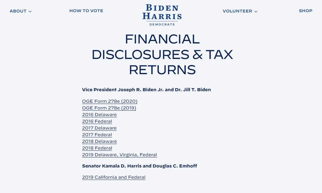 Joe Biden and Kamala Harris proudly displayed their tax filings on the JoeBiden.com webpage.