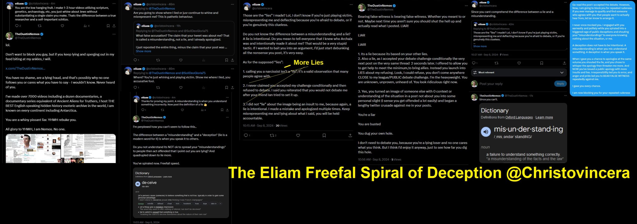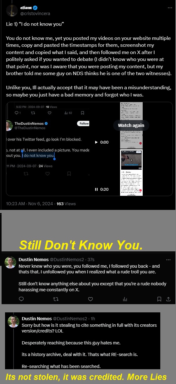 He’s now accusing me of “stealing” his work and “knowing” him, despite it being fully cited and unedited as his work (Assuming it’s even his… He is a liar, after all) and also me having no idea who he was. The video in question exploring the Black Hebrew Israelite identity topic was featured in a debunk debate & Post I did (here) briefly. Again – you can see for yourself if this video was credited or not, as I posted it in full unedited as I found it – proving Eliam/@Christovincera is a LIAR