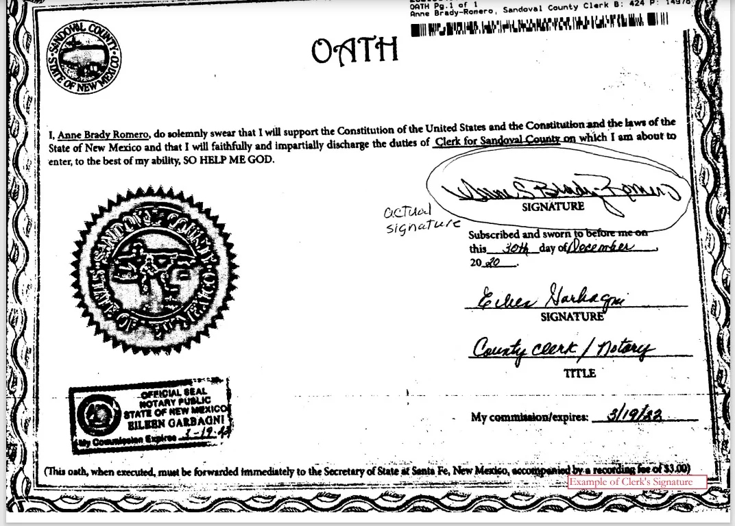 There was NO county clerk seal on any of the 133 certificates, 50 certificates were without a completion date, one had a tabulator technician signature dated November 13, 2022, the clerk did not sign 132 of the certificates, at least 3 different people signed her signature on 131 of the certificates. It appears that tabulator ICE #H0180’s certificate was forged, and a criminal complaint has been filed with the county sheriff’s office. Copies of the certificates and a copy of the ethics complaint that was filed with the SOS office and Ethics Board in Sandoval County were provided for the Sheriff. The sheriff’s case number is 22-001136.