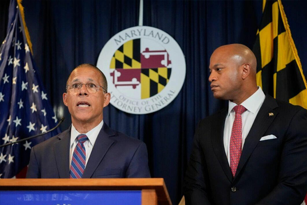 Maryland Attorney General Anthony Brown, left, speaks as Gov. Wes Moore listens during a news conference in Baltimore, MD., on Sept. 24, 2024. Stephanie Scarbrough/AP Photo