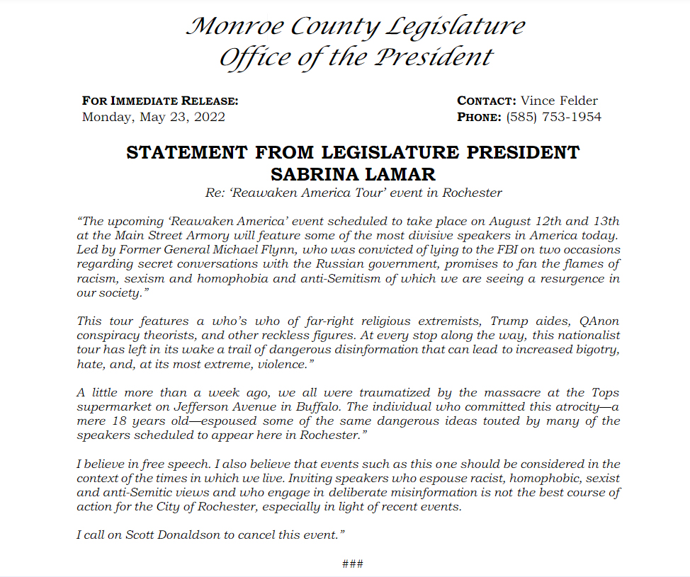 The Democratic Caucus of Monroe County and Monroe County Legislature President Sabrina Lamar released the following statements Wednesay: