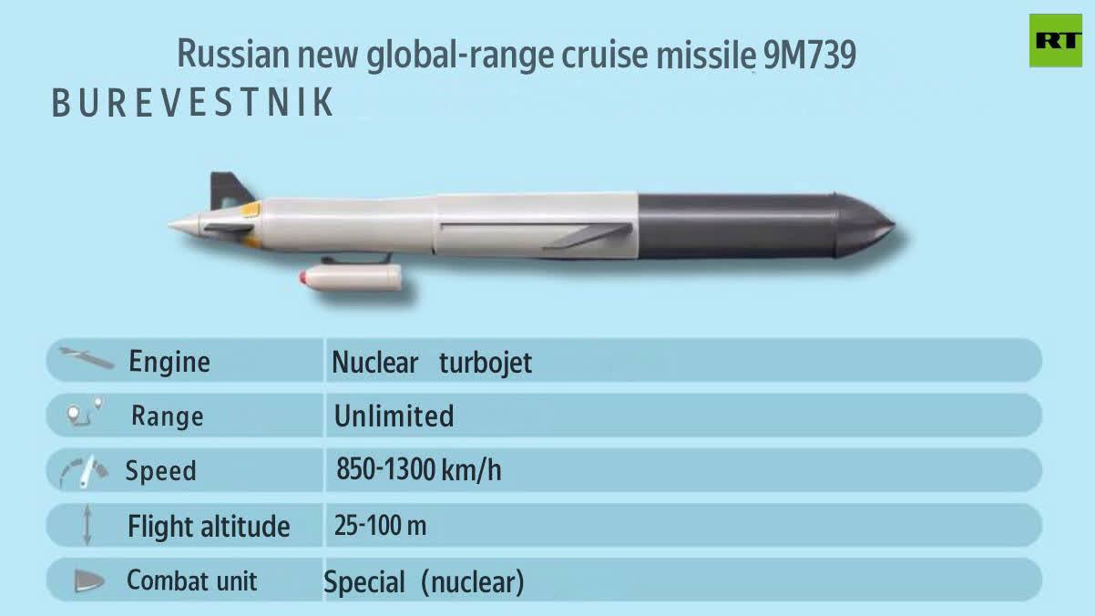 The Burevestnik is a nuclear-powered, unlimited-range strategic cruise missile designed to destroy high-value targets, including fortified bunkers. It is undetectable by conventional radar and can only be tracked by specialized spacecraft during the launch and acceleration phases.