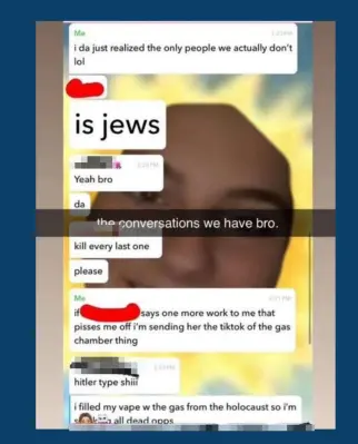 “if ___ says one more work [sic] to me that pisses me off i’m sending her the tiktok of the gas chamber thing,” and “i filled my vape w the gas from the holocaust so i’m smoking all dead opps.”