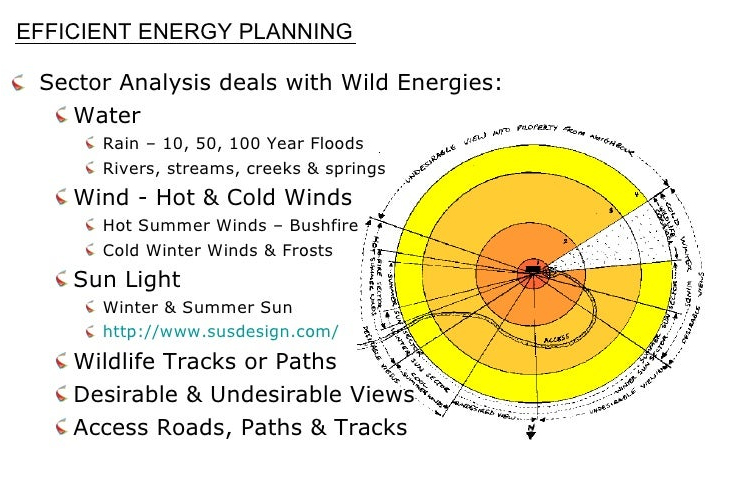 This is basic to self-sufficiency and sustainability and is achieved by analysis of energy ZONES and SECTORS (see images below.).