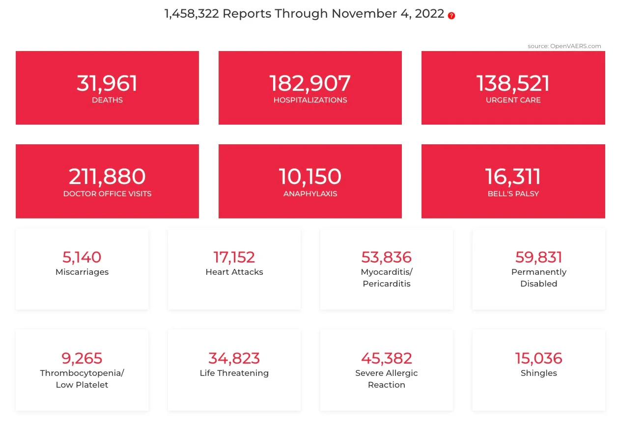Reports from the Vaccine Adverse Events Reporting System (VAERS) including non-domestic reports showed there are now over 1.4 million cases of COVID-19 vaccine adverse reactions including more than 31,961 deaths through November 4, 2022.