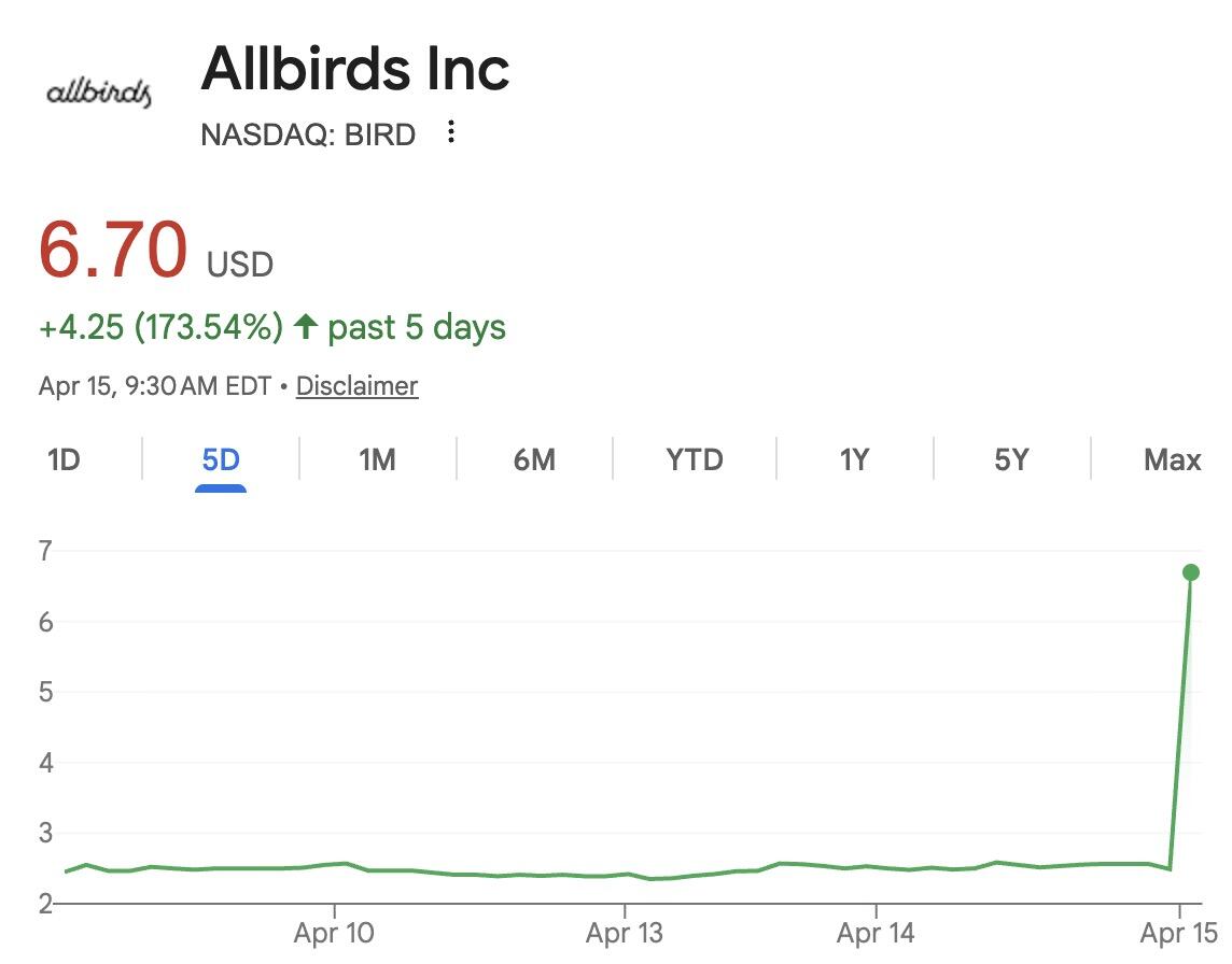 Allbirds (yes, the wool sneaker people) is mooning in premarket—up as much as 176%—after announcing it’s ditching shoes and pivoting to, of course, AI. This comes just weeks after agreeing to sell off its brand and footwear business for $39 million, according to Sherwood News.
