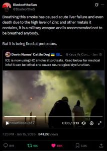 Breathing this smoke has caused acute liver failure and even death due to the high level of Zinc and other metals it contains, it is a military weapon and is recommended not to be breathed anybody. But it is being fired at protestors.