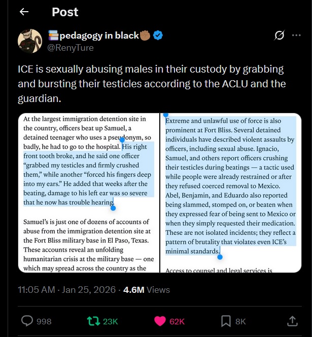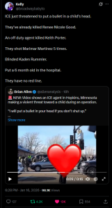 Can someone explain to me why the woman shot by ICE agents in Minneapolis was dragged out of the car and carried all the way down the street when an ambulance could’ve pulled up to the car so that they could start life-saving procedures? Try defending that shit in court and I can tell you there will be a trial, at the very least a civil trial. Good luck to the lawyers defending some of these actions and inactions.