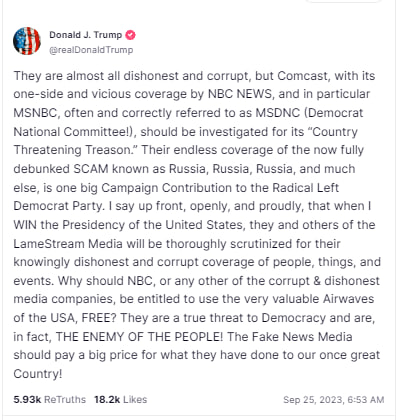 Trump Says MSNBC and NBC News Will Be Investigated for ‘Country-Threatening Treason’ if He is Re-Elected