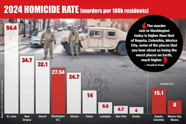Justifying his action Monday morning, the president displayed a chart showing that DC has more murders per capita than the capital cities of cocaine-exporting Columbia, cartel-plagued Mexico, and terrorist hub Iraq.