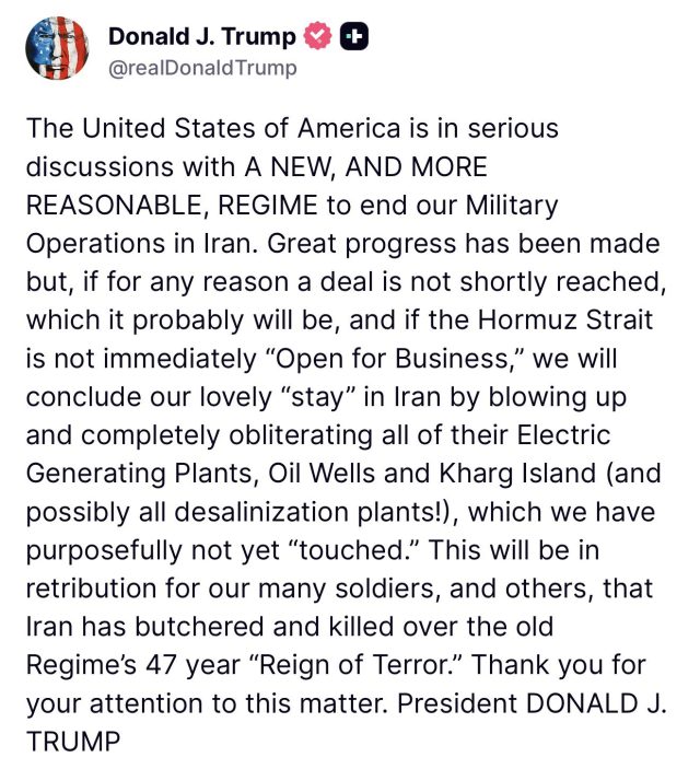 “Great progress has been made but, if for any reason a deal is not shortly reached, which it probably will be, and if the Hormuz Strait is not immediately ‘Open for Business,’ we will conclude our lovely ‘stay’ in Iran by blowing up and completely obliterating all of their Electric Generating Plants, Oil Wells and Kharg Island (and possibly all desalinization plants!), which we have purposefully not yet ‘touched,’” Trump said.