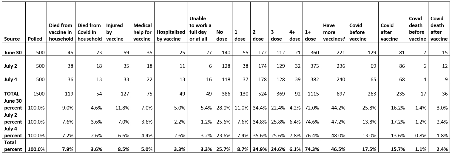The poll also found that 8.5% said they had been injured by their vaccination, 5% that they had sought medical help and 3.3% that they had been hospitalised, the same proportion who said that as a result of vaccination they were no longer able to work a full day or at all. These are percentages of all respondents. If we look only at the 74.3% vaccinated with at least one dose then the figures, as a proportion of vaccinated persons, are 11.5% injured, 6.8% needing medical help, 4.5% hospitalised and 4.5% unable to work. While these figures are self-reported and there is no control group, since the unvaccinated were not asked about adverse events, they are still alarmingly high.