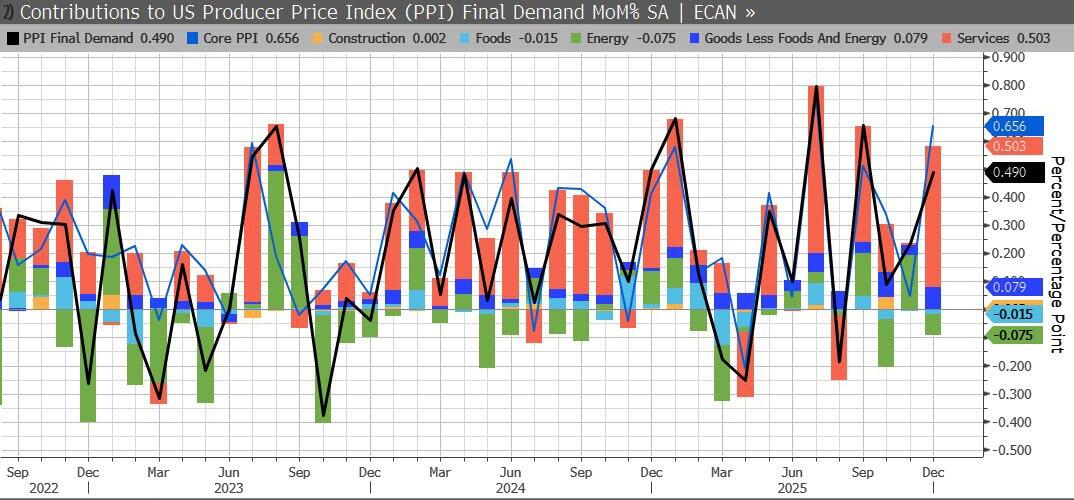 Services costs dominated the rise in the headline PPI (not Goods – which would be affected by tariffs).