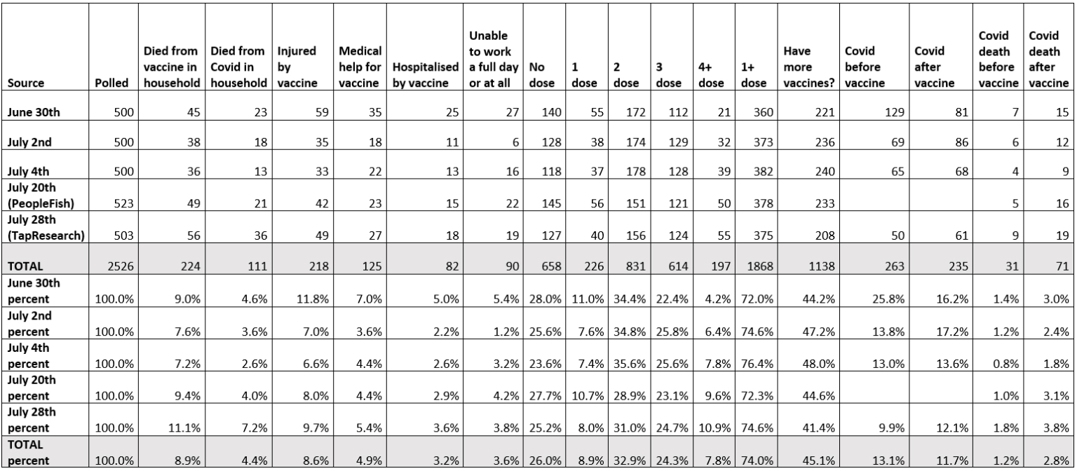 A further question is raised by a sixth poll commissioned by Steve Kirsch (on July 11th), this one much shorter, asking only two questions, one about household members having Covid and one about them having a vaccine injury. It found 22 of the 500 respondents (4.4%) reported a vaccine death in the household versus 40 (8%) who reported a Covid death. These proportions are still high, but they are not consistent with the other five polls, the two figures being reversed. Is this survey anomalous or would it be replicated in similar short polls? If so, it may indicate a source of bias in the length of the poll.