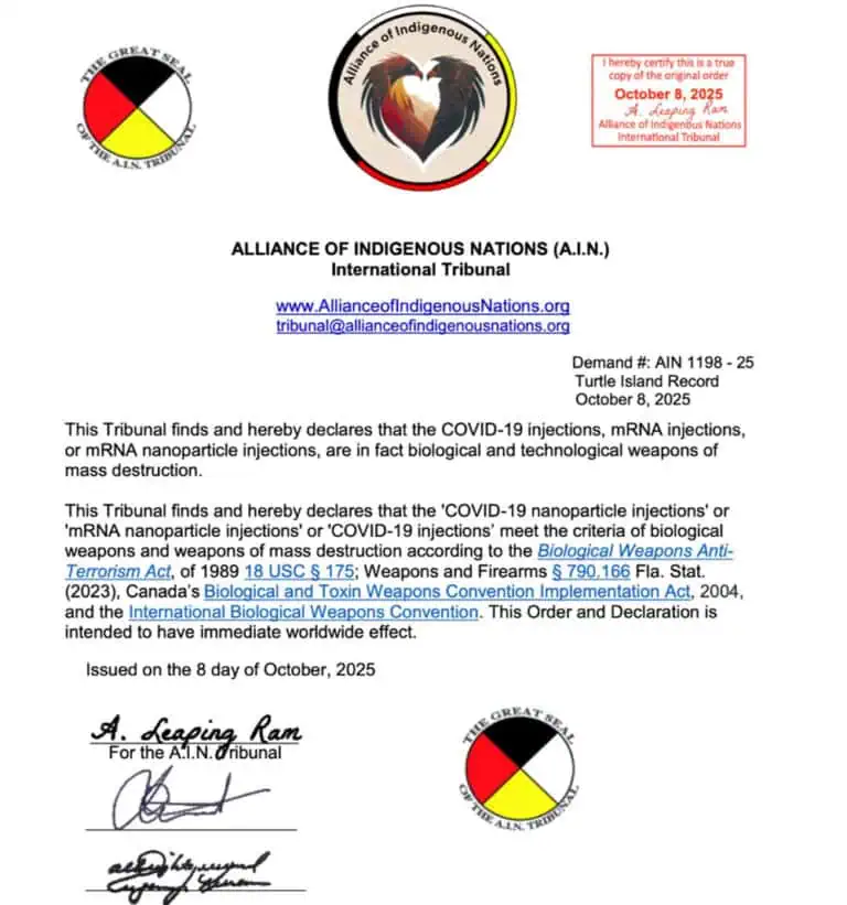 The Alliance of Indigenous Nations (AIN) International Tribunal announced that the ruling applies globally under international law.