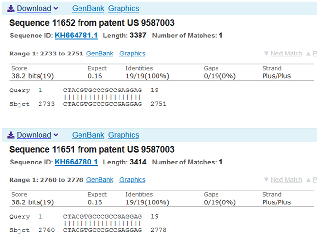 I decided to check their work. Yes. I fact checked them (I will send an invoice to the globalists). This turned out to be a bit of an epic journey. The Google patent page for US9587003B2 does not contain the gene sequence. The pdf of the patent does not contain the gene sequence and is not searchable from pages 101-304. But it does have a link to a lengthy ‘Sequence Listing” section which link one cannot copy. So I manually transcribed it in my fair hand – http://seqdata.uspto.gov/?pageRequest=docDetail&DocID=US09587003B2