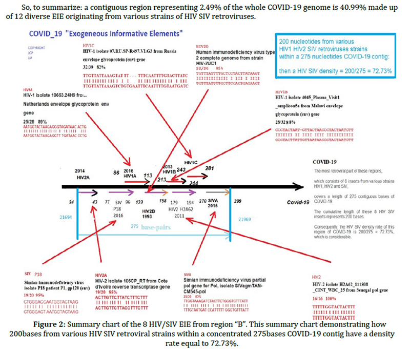 Prof Luc Montagnier, before he died on 2022February8, did a total assassination of the concept that Covid-19 evolved naturally by showing that it had massive equivalence to HIV. The diagram below shows a 275 nucleotide region of Covid-19 which has 200 nucleotides from HIV/SIV (Simian ImmunoVirus) in it. And remember there are 61 codons specifying 20 amino acids. So one can say the same thing in on average 3 different ways with codons.