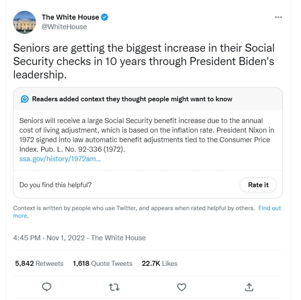 The White House deleted a tweet bragging about the 8.7 percent cost of living increase for Social Security recipients for 2023 after a fact check was added by Twitter noting the COLA was mandated by a 50-year-old federal law that payments keep up with inflation, making Biden’s boast a self-own highlighting roaring inflation that took off after he took the White House in January 2021.