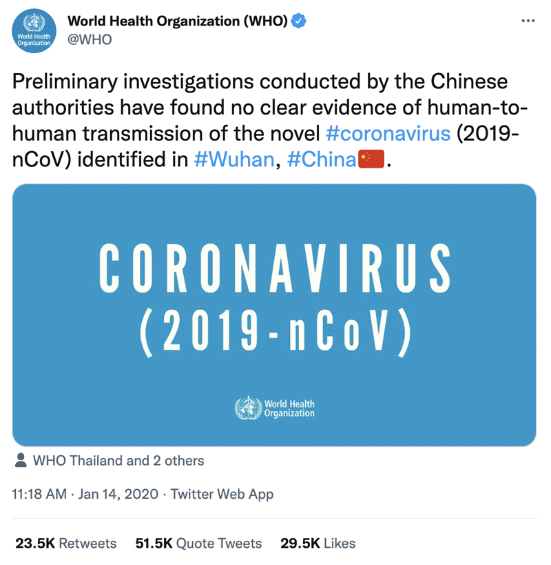 While these WHO members are railing against what they deem to be misinformation, the WHO itself is infamous for pushing misleading information during the early stages of the Covid pandemic. In a January 2020 tweet, the global health agency amplified a claim from Chinese authorities that there was “no clear evidence of human-to-human transmission” of the coronavirus.